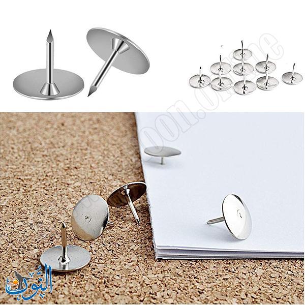 دبوس لوح بلون فضي مخصص لتثبيت الملاحظات والصور والأوراق على لوحات الفلين والأسطح القابلة للتثبيت. يأتي في علبة كرتونية تحتوي على 50 قطعة، مما يجعله خيارًا عمليًا للمكتب، المدرسة أو المنزل. يتميز برأس دائري عريض يسهل الضغط والتثبيت، ومسمار معدني متين يوفّر ثباتًا جيدًا. يُعرف أيضًا في السوق باسم دبوس طبعة، ويُستخدم لتنظيم وعرض الأوراق بطريقة مرتبة وأنيقة.