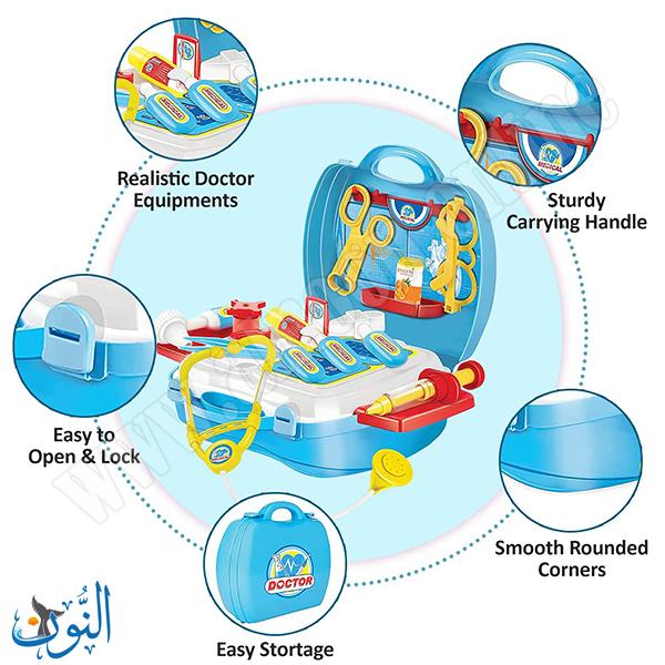 حقيبة الطبيب المحمولة من ماركة BOWA هي مجموعة تعليمية شاملة تحتوي على 18 قطعة طبية واقعية داخل صندوق تخزين متين وسهل الحمل. تتضمن المجموعة أدوات محاكاة طبية مثل سماعة الطبيب، النظارات الطبية، المحقنة، المقياس الحراري، المطرقة الانعكاسية، المشرط، الملقط، والميكروسكوب، بالإضافة إلى أدوات دواء وهمية. تم تصنيع جميع القطع من مواد بلاستيكية عالية الجودة غير سامة ومعتمدة حسب معايير السلامة الدولية، مع حواف ناعمة وآمنة للأطفال. تساعد هذه المجموعة على تطوير المهارات الحركية الدقيقة والتنسيق بين اليد والعين، كما تعزز المعرفة بمبادئ التشريح البشري وتخفف من رهبة الأطفال من زيارة الطبيب. تُعد هذه الحقيبة أداة تعليمية مثالية للعب الفردي والجماعي، وتناسب الأطفال من عمر 3 سنوات فما فوق.