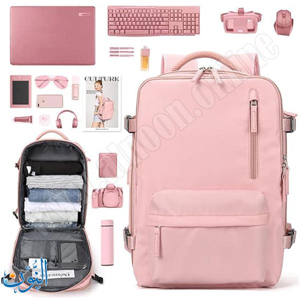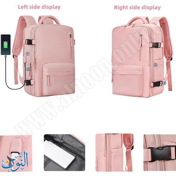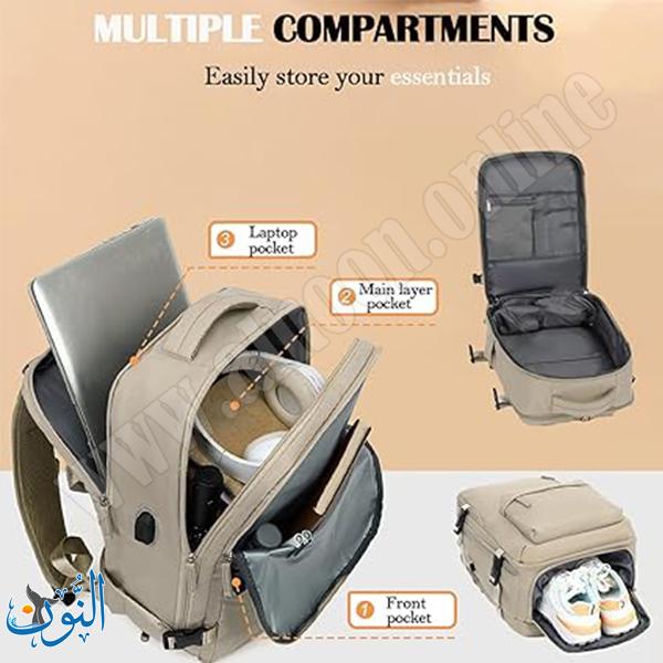 تأتي الحقيبة مع منفذ USB خارجي مع كابل داخلي لشحن الأجهزة بسهولة (بدون باور بنك)، كما تحتوي على جيب خلفي مضاد للسرقة لحفظ الأغراض المهمة، وحزام خلفي للتثبيت على حقيبة السفر. يمكن فتح الحقيبة بزاوية 180 درجة لسهولة الاستخدام والتنظيم، مما يجعلها مثالية للسفر، العمل، الرحلات، والاستخدام اليومي.
