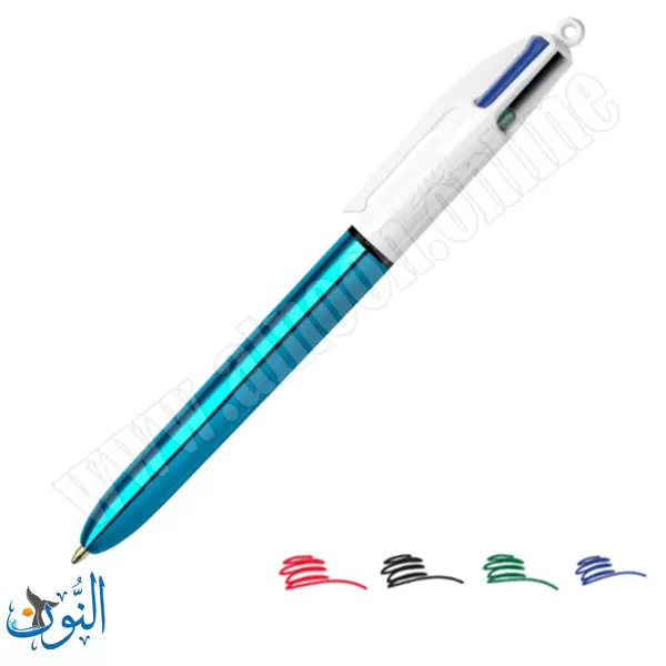 قلم حبر جاف أنيق من BIC يجمع 4 ألوان في قلم واحد (أسود، أزرق، أحمر، أخضر) مع تصميم لامع وكتابة ناعمة، مثالي للدراسة والعمل.