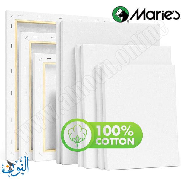 لوحة قماش من Maries بسطح أبيض ناعم مطلي وجاهز للرسم، مصنوعة من قطن 100% ومشدودة على إطار خشبي متين. متوفرة بأحجام متعددة ومناسبة للألوان الزيتية والأكريليك.