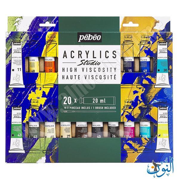 طقم ألوان أكريليك Pebeo Studio – 20 لون × 20 مل + فرشاة يوفر مجموعة ألوان متنوعة وعالية الجودة للفنانين والهواة، مع قوام أكريليك عالي اللزوجة مناسب للرسم بطبقات وحتى للعمل بأبعاد وملمس واضح. الألوان تجف بسرعة وتترك لمسة نهائية ساتانية غير لامعة مع قدرة جيدة على الاحتفاظ ببصمات الفرشاة أو السكين عند الحاجة، ويمكن استخدامها مباشرة من الأنبوب أو خلطها معًا للحصول على درجات مخصصة وتأثيرات متعددة. الطقم يشمل فرشاة واحدة لبدء العمل مباشرة، ويمنحك مجموعة ألوان غنية وقابلة للدمج على الورق، القماش، الخشب والأسطح الفنية الأخرى، مما يجعله خيارًا ممتازًا للمبتدئين والفنانين في المشاريع الإبداعية المختلفة