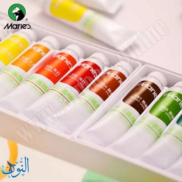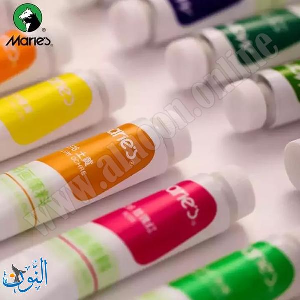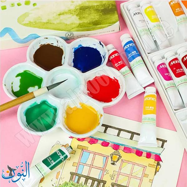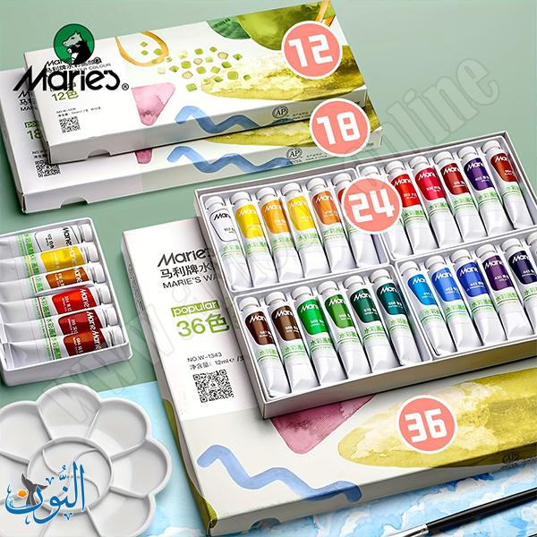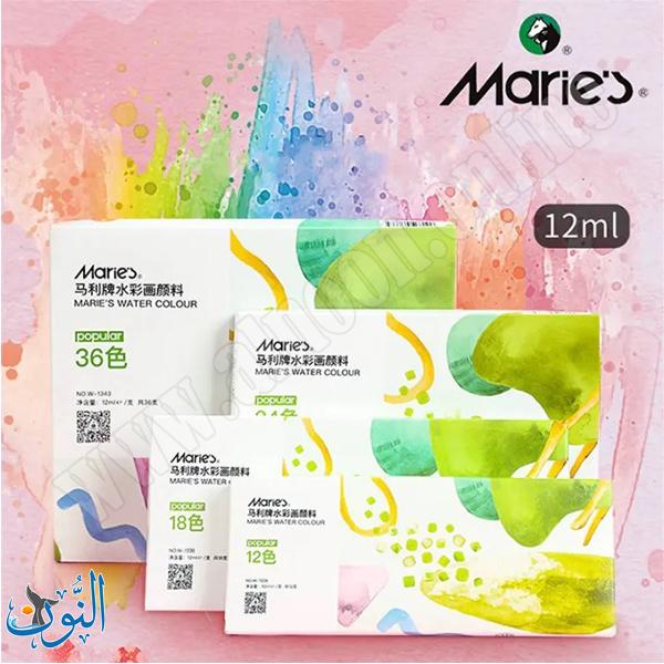 طقم ألوان مائية من Maries بعبوات 12 مل، يتميز بألوان زاهية عالية التصبغ وسهلة الغسل، قابلة للدمج والتدرج. تصميم عملي ومحمول، مناسب للطلاب والهواة والاستخدام اليومي في المشاريع الفنية.